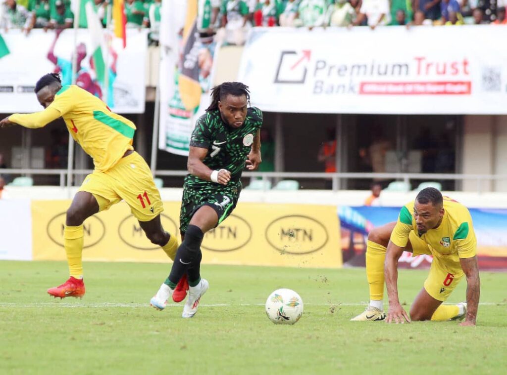 PHOTO: Lookman leaves two Beninoise players in his wake in the AFCON 2025 qualifier in Uyo, in which he netted a brace.