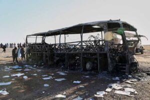 Cleanup teams were working to remove the torched shell of the bus and twisted wreckage of another vehicle on the roadside early on Wednesday.