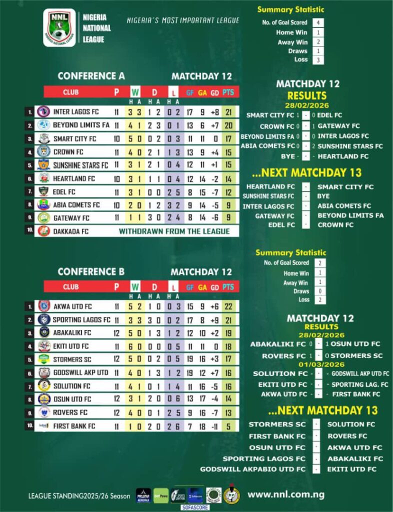 Other notable results in Conference A include Smart City’s 1-0 win over Edel FC, Gateway’s 1-0 victory over Crown FC, and Sunshine’s 2-0 triumph over Abia Comets. The wins have injected fresh momentum into the teams’ title aspirations, and the conference is shaping up to be one of the most competitive in the league.
