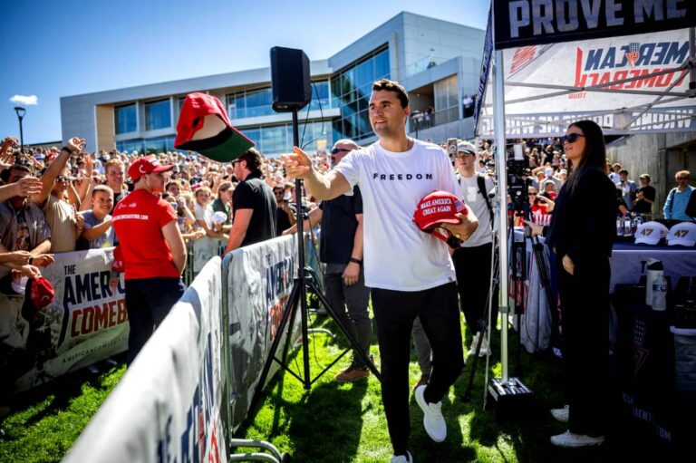 Kirk’s appearance on Wednesday was the first in a planned 15-event “American Comeback Tour” at universities around the country. He often used such events, which typically drew large crowds of students, to invite attendees to debate him live.
