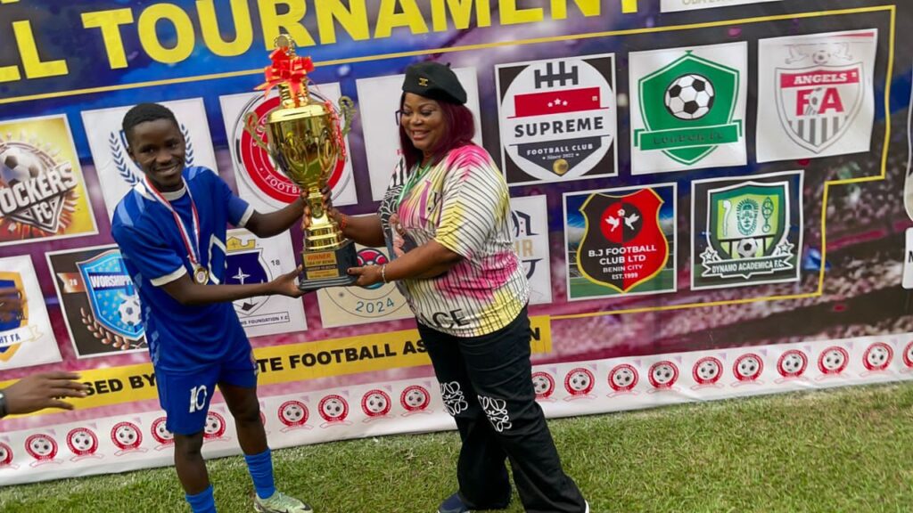 The closing event of the tournament in honour of the Benin Monarch, was well attended by stakeholders of the game, Ex- internationals, top football coaches and the wife of the cup donor and sponsor Mrs Vera Ogbebor who stood in For her husband, Michael Ogbebor, a USA based Ex Footballer.