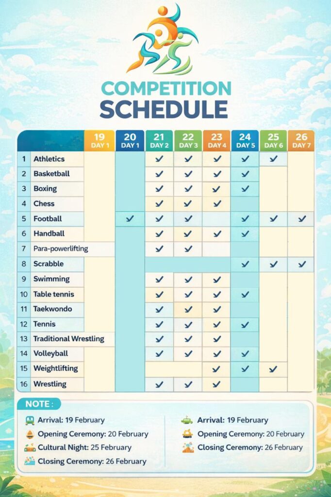 Share Facebook Twitter LinkedIn Pinterest Email FOOTBALL CATEGORY MEN Day : 1 Date: 20/2/2026 Match: #1 Imo vs Bayelsa – 9:30am Match:#2 Delta vs A/Ibom – 12:00 pm WOMEN Day: 1 Date: 20/2/2026 Match:#1 Edo vs A/Ibom – 9:30am Match no:#2 Bayelsa vs Rivers – 12:00pm Football Frenzy Update: Niger Delta Games 2026 Heats Up Niger Delta Games 2026