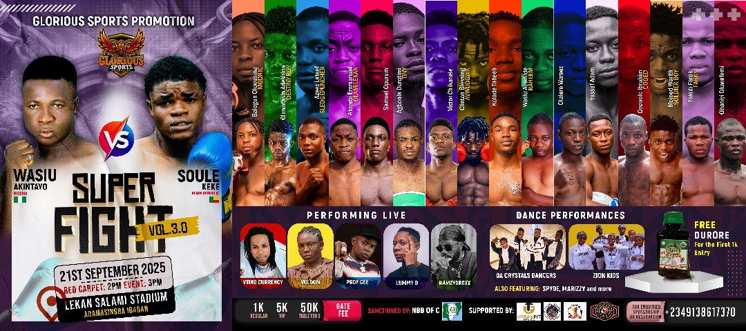 Ibadan the capital city of Oyo State will be enlivened this Sunday 21st September 2025 when Glorious Sports Promotions will be staging a boxing show tagged: Super Fight 3.0 at indoor sports hall of Lekan Salami Sports Complex, Adamasingba Ibadan.