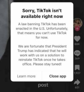 Visitors to the app were met with a message reading: “A law banning TikTok has been enacted in the U.S. Unfortunately, that means you can’t use TikTok for now. We are fortunate that President Trump has indicated that he will work with us on a solution to reinstate TikTok once he takes office. Please stay tuned.”