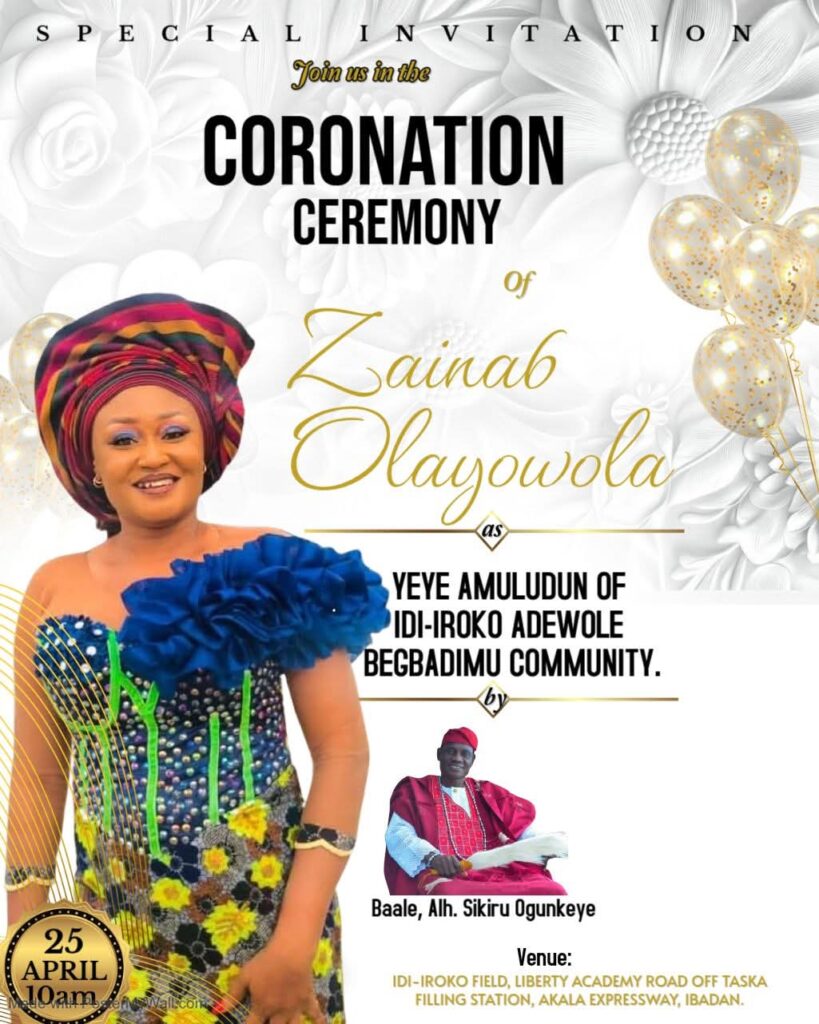Residents and stakeholders of the Idi-Iroko Adewole Begbadimu Community in Ibadan have extended warm congratulations to media personality Zainab Olayiwola following her schedule coronation as the Yeye Amuludun of the community.